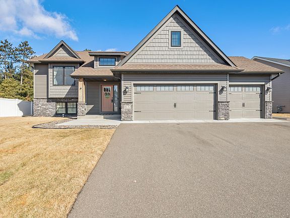 The roomy foyer greets you with a coat closet and a unique stairway leads you to both the upper & lower levels. The kitchen is a chef’s dream, featuring quartz countertops, a walk-in pantry, and a beautiful center island. The adjacent dining area boasts a striking bay window with views of the backyard, perfect for enjoying meals with a scenic backdrop. The home is adorned with vinyl plank flooring throughout the kitchen, dining, foyer, and pantry, providing both durability and style. Knotty alder shaker cabinets add warmth and character to the space. The primary bedroom offers a walk-in closet and a convenient walk-through primary bathroom. The unfinished walk-out lower level presents an exciting opportunity for customization, with space for 1 or 2 bedrooms, a full bath, and a large family room. Additional features include an insulated & heated 3-car garage with insulated doors, an in-ground sprinkler system, and a paved driveway w/ paved pad on side of home. Don't miss the opportunity to make this charming, move-in ready home yours!