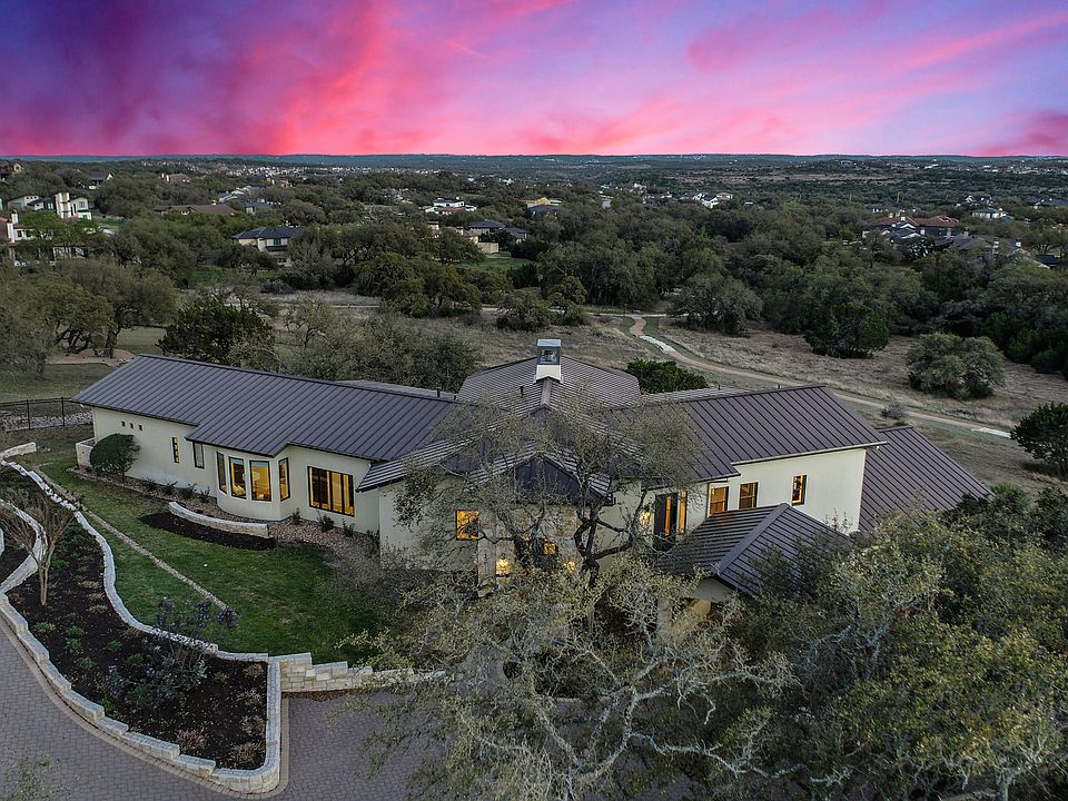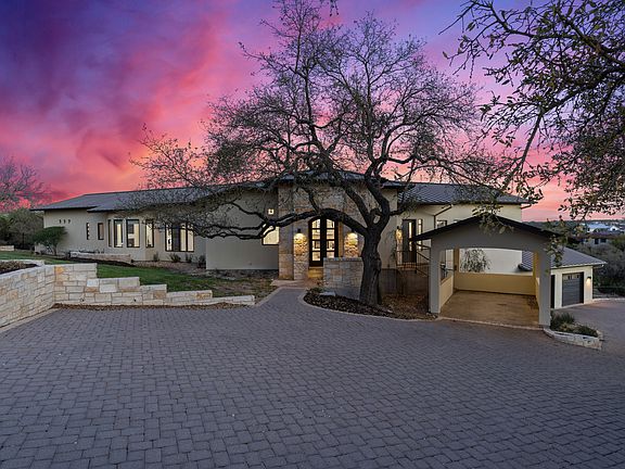 Turn-Key, Furnishings and All! Come experience one of the most private homes of the renowned LTISD located in the exclusive Belvedere gated community. This custom home by award-winning Camelot Custom Homes was completely and exquisitely remodeled in 2021/2022 with the most discerning finishes. Boasting over 5,000 sf, this grand, impressive, and timeless home also is home to some of the most incredible views the hill country has to offer. Upon entrance, you'll find yourself in the welcoming lobby/formal living space, adorned with a floor to ceiling double sided stone fireplace. With a sought-after open floor plan, the home feels grand, yet warm and inviting, ready to entertain. Each room is full of natural light and incredible views that draw you into a seamless indoor/outdoor living experience. Wide plank white oak hardwood floors run through the majority of the home, accented with natural quartzite tile flooring. The kitchen provides an elegant blend of old-world style with modern details, creating the perfect atmosphere to entertain. The stunning porcelain island is encompassed by the remaining quartz countertops and walls, along with a built-in walnut butcher block. A huge walk-in pantry and butlers pantry live adjacent to the main kitchen. The variety of textures and finish out come together effortlessly for an incredibly chic feel. Every light fixture and ceiling fan has not only been upgraded with the remodel, but so carefully selected, each room feels like a work of art. Shade Store shades and drapes throughout make every window dressed to not only impress, but to perform for years to come. The primary bedroom features high ceilings, a sitting area, and patio access with breathtaking views. The primary ensuite features a large garden tub, separate shower, dual vanities, and a large walk-in closet with built ins. The executive office is also located in the primary, eastern wing of the home, with its own set of windows, encompassing the hill country views. Downstairs you will find the family living space and wet bar, secondary bedrooms, and another outdoor patio that leads to the pool and the nearly 1.5 acre yard. BOSCH and Thermador appliances except for the downstairs wet-bar Smeg fridge. A fabulous cobblestone driveway makes for a grand entrance as you approach the home. Parking is available near the main entry, in the porte-cochere, the attached oversized two car garage, or in the detached two car garage. The detached garage was designed with the intention of converting to a pool house or secondary living space, plumbing and electric are already in place. Home has been pre-inspected and is squeaky clean! The home was also updated with three brand new, two-stage HVAC systems with air purifiers. Neighborhood amenities include a community pool/lazy river, hike and bike trails, sports court, park, fishing pond, and playground. Nearby attractions include shopping, dining, lake life, and an abundance of wineries, distilleries, breweries and more!