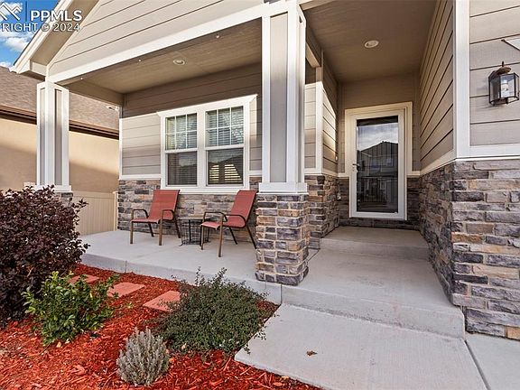 Step into this pristine Ranch Style Home, nestled in the master-planned Cumbre Vista Community, where 5 acres of open space are the heart of the neighborhood, creating a peaceful & idyllic setting. A welcoming front porch sets the tone for this modern open floor plan home. Upon entry, warm wood laminate flooring guides you through the main level Great Room, creating a cozy & inviting atmosphere. The gourmet kitchen features a gas range with double oven, stainless steel appliances, granite countertops, pantry, & island with a countertop bar. A convenient mudroom with built-ins at the garage door entry adds practicality to daily living. From the kitchen, effortlessly transition into a lovely dining area & a spacious family room adorned with a cozy fireplace framed with floor-to-ceiling stacked rock. This space opens up to a back deck, offering a perfect spot for outdoor relaxation & entertainment. The Main Level Primary Suite is a sanctuary, featuring abundant natural light & an adjoining 5-piece bath. The bath boasts a double vanity with quartz countertop, large soaking tub, walk-in shower, & a spacious walk-in closet with easy access to the main level laundry room. Additionally, this level hosts a second bedroom & a full bath. Venture downstairs to discover a generously sized entertainment space with a small kitchen area that includes a sink, refrigerator, & dishwasher. From this room, step out onto a covered patio that extends into a fully fenced backyard, creating a seamless indoor-outdoor living experience. This level offers two more bedrooms, a full bath with a dual vanity. Enjoy reduced energy costs with a 9-panel solar system and added protection with a Class 4 shingle roof (installation scheduled). This home's location ensures easy access to parks, trails, & highly coveted D-20 schools. Convenient proximity to the Powers & Woodman Corridor, where you'll find a wealth of shopping, restaurants, & entertainment options in the vibrant Briargate & Wolf Ranch area.