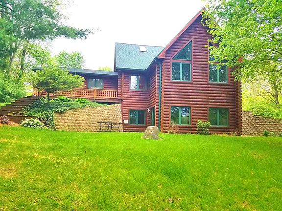 Absolutely GORGEOUS LOG CABIN that features almost 3000 sq ft surrounded by trees, and a gorgeous view of your own privately stocked pond. The house has 3 bedrooms and 3 full baths with the master suite on the main floor. The kitchen is newer with sleek stainless steel appliances and granite counter tops. There is even a walk out sliding door in the dining area that leads to the deck. The living room has vaulted ceilings and is open to the loft above for a spacious feel. The house also contains a large walkout basement complete with family room and a full bath. There is newer roofing on both the house and the 30x45 FBI pole building. If that wasn't enough, this house sits on over 2 acres of quiet country side land.