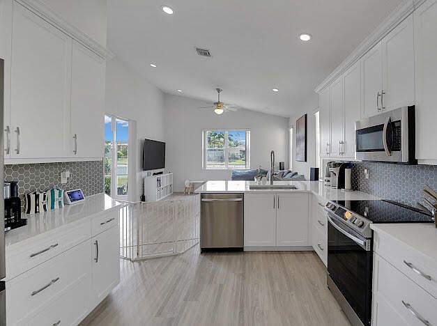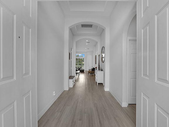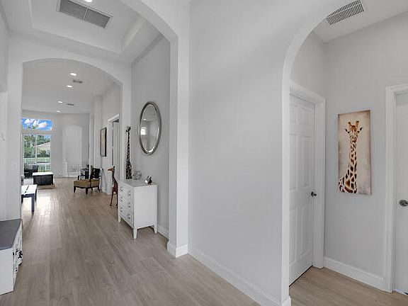 Move right into this lovely one-story lake view home with fenced-in yard located in the gated community of Isola Bella! 4- Bedrooms, vaulted ceilings, beautifully updated with new waterproof luxury vinyl plank flooring throughout, an abundance of recessed lighting, center lake view plus large yard and covered screened-in patio. Newly renovated kitchen is open to the family room and features stainless steel appliances, white cabinets, & quartz countertops. Freshly painted exterior, 2021 AC , 2020 HWH, & hurricane protection. Isola Bella is a pet-friendly community with a 24-hour manned gate conveniently located with A-rated schools. Amenities include a clubhouse, fitness center, resort-style pool, basketball court, tennis, pickleball, playground and more!
