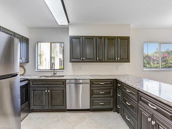 The beautifully remodeled 2 bed, 2 bath condo is ready to be your winter retreat or a great investment opportunity. Located just off Summerlin Rd you will be close to everything that downtown Fort Myers has to offer, including the Edison and Ford Winter Estates. This first floor condo has been totally redone and is ready to be lived in with a large open great room with large square tile flooring laid on an elegant diagonal pattern and plenty of room for living and dining and opens to the sunny lanai where you can enjoy your morning coffee overlooking the expansive greenspace. You’ll love the kitchen with its rich, dark cabinetry wearing granite countertops, stainless steel appliances and a large peninsula, perfect for extra seating. The generous owners suite includes a large closet, private ensuite and access to the lanai. A guest room and another well appointed bathroom round out this lovely home.