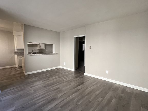 Freshly painted 2-bedroom 1 bathroom ground level apartment with 2 parking spaces and an on-site community laundry room. It features a galley kitchen with Granite counter tops, ample freshly painted cabinets with modern hardware, as well as a dinette area, vinyl plank flooring, a cantilever dining bar that can serve as additional dining space, large closets, tiled bathroom, ceiling fans, and a wall AC unit. It is conveniently located near schools, shopping, and public transportation.