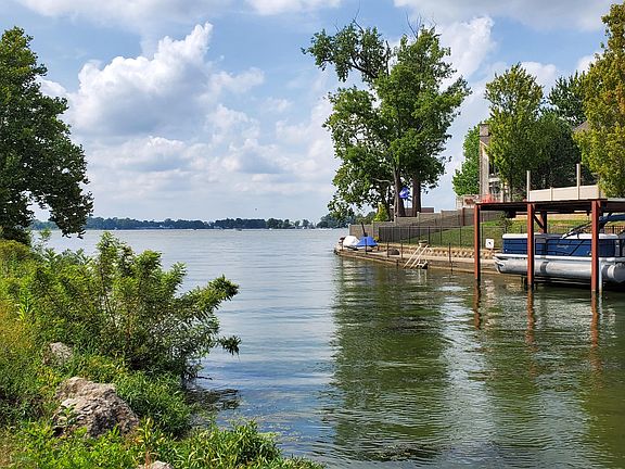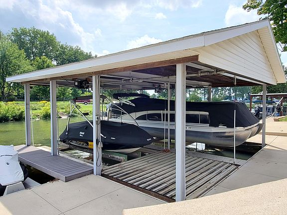 Location, location, location! Don't miss this cozy 3 bed, 1.5 bath waterfront ranch with finished basement on the highly desired street of Blue Heron Cove. Features 97 feet of waterfront, steel double boat dock with electric lifts, and two Dandy Docks for jet skis. You'll love relaxing on the two-level deck with peaceful views of Indian Lake and Moundwood State Park. Dock, deck and trim was professionally painted recently. Inside you'll find a spacious living room with gas fireplace, large kitchen with tons of storage, and updated bathrooms. The basement was finished in 2008 to add an additional living room, bedroom, and is wired with Dolby 5.1 cinema sound system. The large concrete driveway has enough space to park up to five cars! This great property won't last long! Furnishings are negotiable. Agent related to seller.