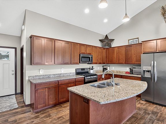 Welcome to this beautifully designed open concept home featuring a vaulted ceiling that seamlessly connects the living room, dining area, and kitchen which is perfect for entertaining and everyday living. The spacious primary suite is privately situated on one side of the home and offers a large walk-in closet with a separate tub and shower. On the opposite side, you’ll find two additional bedrooms, a bathroom, and a convenient mudroom/laundry area. The insulated and heated oversized three car garage is truly an extension of the home, complete with a finished ¾ bath ideal for hobbyists, sports enthusiasts, or anyone dreaming of their own man cave. The unfinished basement offers endless potential for additional living space, including a future family room, bedroom, and bathroom. Enjoy the peaceful backyard with no rear neighbors, a deck, and a storage shed—all on a spacious lot with pad and electric ready for a hot tub. This is the newest built home in the neighborhood and ready for its next owner!