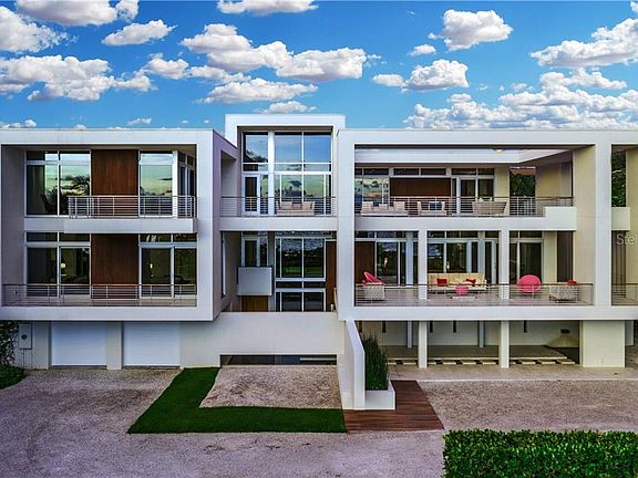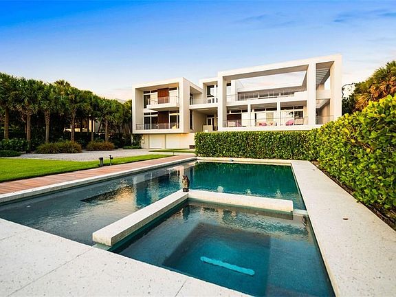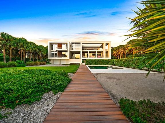 Be prepared to be captivated by this one-of-a-kind, custom-built, magnificent Gulf-to-Bay contemporary masterpiece built in 2011 by the Americana Institute of Architecture gold-medal architect Guy Peterson. It is located on a prime 1.2 acre parcel on the coveted north end of Casey Key, with grand sweeping and unobstructed views of the Gulf of Mexico and an elegant saltwater pool in the front. This architecturally significant home has been a finalist in Wall Street Journal's House of the Year, a winner of numerous design awards and been showcased in several newspapers and magazines. Peterson, in collaboration with architect & designer Robert Couturier, general contractor, Michael K. Walker & Assoc. and the current owners, spared no efforts in design, resourcing of materials or expenditures in creating this grand home. This 3-level residence stands as a beacon of achievement in architectural design, yet inside, it lives with comfort, spaciousness & minimalistic style. Throughout the home, the terrazzo shell concrete floors and mahogany surfaces bring elements of the outdoors in, creating an environment that is enriching and peaceful. Throughout the residence are many distinctive and special touches. The centerpiece of the home is the grand staircase with three levels of stairs composed of glass, steel and with Mahogany treads. Also unique to the house, is a glass panel divider, called SmartGlass, which, when activated, switches from clear to opaque, dividing the grand staircase from the dining area. The abundance of hurricane-strength windows and sliding doors, stretch nearly everywhere from floor to ceiling and wall to wall, bringing in breathtaking views of sunsets over the gulf, and gnarled Live Oak trees and Sarasota Bay in the back. The home, offers a rare ownership opportunity and boasts 4 en-suite bedrooms, 2 half baths, 2 laundries, a spacious office, elevator, 4-car garage, a dozen spacious outdoor terraces and sun decks, meticulous landscaping, reflection pools, two gas fireplaces, premium cabinetry, fixtures and appliances, a dock with jet ski lift & an ultra-premium kitchen with opaque glass surfaces.