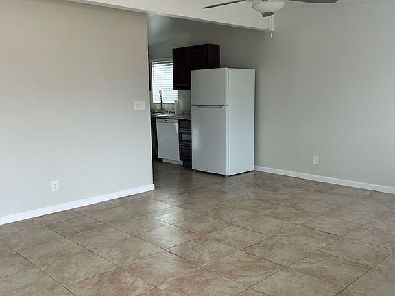 690 sq. ft. 2 bedroom, 1 bathroom unit. Galley kitchen newer cabinetry, built in microwave, built in butcher block countertop, Formica counters, washer/dryer stackable hook-ups and stainless steel appliances, including white fridge. Tile flooring two-out. Bathroom, has Linen cabinetry, petal stool sink, and tub & tile combo. Tile flooring in bedrooms with ceiling fans. Bistro style backyard. Large front lot. Fridge will be provided but not warrantied.