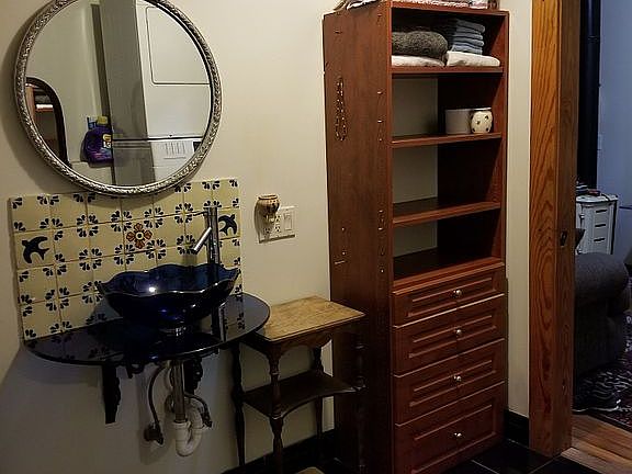 Main living area includes one bedroom and a sleeping loft in the main room. It has a large bathroom with stacking front load washer/dryer. Spacious eat-in kitchen. Large wooden deck on east side of the tree-shaded lot. Beautiful windows and several skylights. Three new Mitsubishi mini splits for heating and air conditioning. Walk out finished basement with bathroom and two spacious rooms.