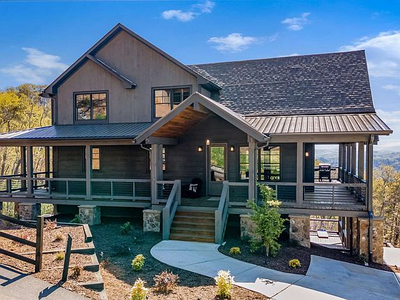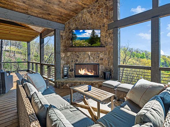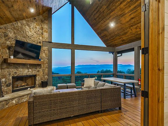 Welcome to your Dream Mountain Retreat! Professionally decorated luxurious 4-bedroom + bunk room, 4.5-bath home is nestled amidst the breathtaking beauty of Blue Ridge. Located in the gated community of Blue Ridge Heights just 2 miles from historic downtown area, this stunning property offers the perfect blend of serenity & convenience. Step inside and be captivated by the seamless fusion of rustic charm and modern elegance. Open-concept floor plan allows natural light to flood interior. Wide plank hardwood floors, vaulted ceilings, & exposed wood beams add touch of sophistication, while large windows frame picturesque mountain vistas. The beauty continues outside on expansive deck offering a front-row seat to nature's majesty. Indulge in al fresco dining, entertain guests, soak in the hot tub or savor a glass of wine beside exterior fireplace & watch the sunset over the mountains.
