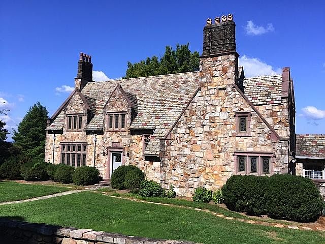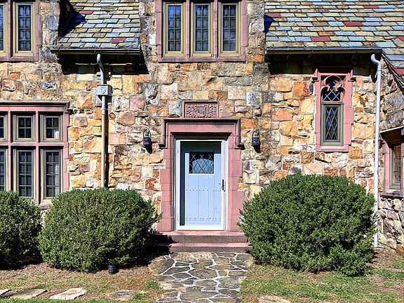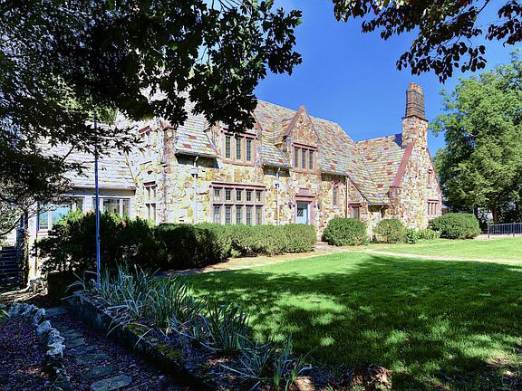 First time offered. Fabulous English Tudor style home of mountain stone situated with over 200 feet on the western brow. Home is noted for fine architectural detailing throughout, with its steeply pitched slate roof, stone chimneys and chimney pots, custom Pella windows, handsome fireplaces and panelling. Stone patio spans the rear of the home and overlooks pristine formal gardens that grace the back yard and lead to the bluff.