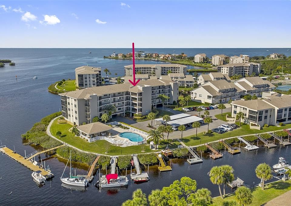 Enjoy an incredible bird's eye view of the Cotee River and canal with partial view of the Gulf of Mexico. Water view from the kitchen, dining room, living room and master bedroom. Two bedroom unit with carpet in the main area and bedrooms and tile in the foyer, kitchen, baths and lanai. In unit washer and dryer, breakfast bar into great room, great room has sliding door access to lanai which offers breathtaking water views! Master bedroom with shared water view and sliding door access to the lanai. Master bedroom has large walk in closet with custom adjustable shelving and large medicine chest and vanity as well as walk in shower. Guest bedroom with built in office and closet with custom adjustable shelving. Guest bath with tub/shower. Cabinetry throughout is original, with the exception of added kitchen cabinets, but neutral in color. New hot water heater May 2024. Perfect for you to make your own! Community offers 24 hour manned security gate, private boat ramp, waterfront boardwalk, fishing pier, putting green, tennis courts, pickleball, two heated pools with cabanas, gas grill and refrigerator. Beautiful new clubhouse with fitness, library, game tables and game/card room. Organized activities and clubs. One assigned under building parking spot and guest parking. Boat docks and RV/Boat storage for purchase upon availability. Also optional kayak storage (additional fee, upon availability). Close to waterfront dining, waterfront activities, grocery, medical, historic downtown New Port Richey, Simms park, approx 20 mn to Tarpon Sponge Docks, approx 45 min to Tampa airport, cruise port, theme parks, sports arenas, fine dining, theatre. Approx 60 min to Clearwater Beach, Clearwater Aquarium and many public beaches in between. No pets/ Not age restricted.