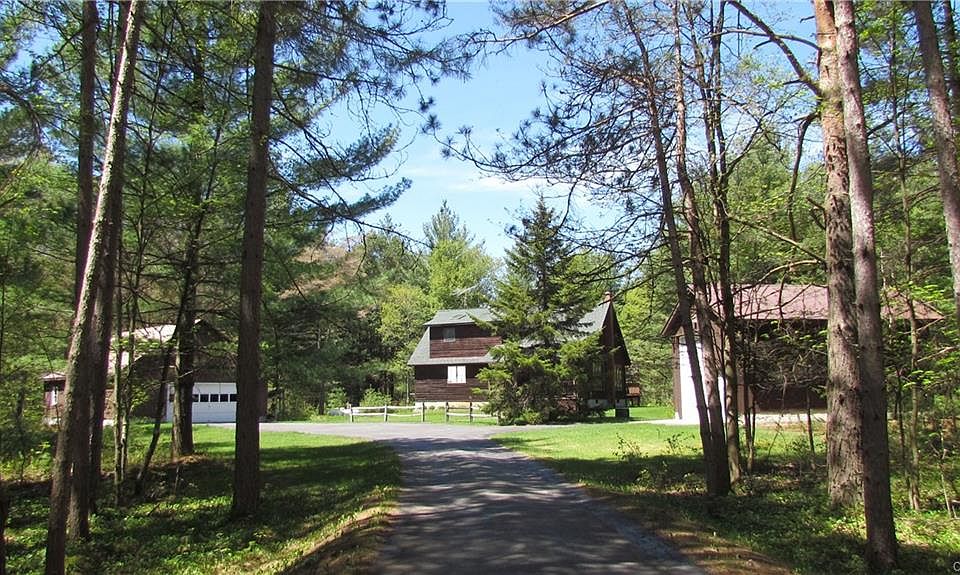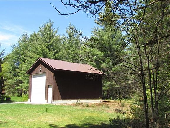 Drive into this park-like setting with 4 car garage on your left and 30x36' pole barn with high overhead door to store camper on your right. Center of attention is beautiful cape home with full covered porch in front. Open floor plan with plenty of windows for natural lighting. First floor bedroom, full bath and laundry. Second level master bedroom, bath and full walk-in closet. If that's not enough, there is a full basement finished with rec room and two bonus rooms - one for utilities and one currently used as a workshop. Then you step out onto the back deck to listen to the sounds of nature. Over 56 private acres to enjoy with trails leading to a custom built lean-to with campfire in front.