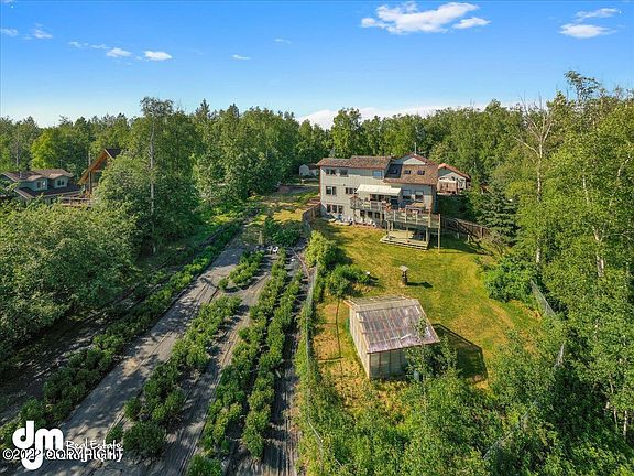 A must see with over 2 acres of land, filled with fruit trees and peonies! Amazing 3,800 SF home with stunning views of the Chugach Mountains & Cook Inlet, that will never be threatened as the property extends down to Boggle Bluff Street. The front yard features a a park like setting with numerous apple trees, kiwi bushes that bear fruit every season. Owners have owned a Peony business for years.Home also includes a sauna, hot tub, RV parking, patio and walk in cooler. Please see documents for added home features, list of improvements, and bill of sale with multiple items staying with the sale