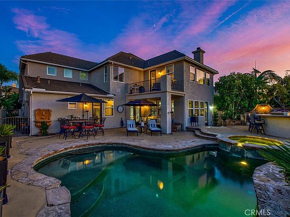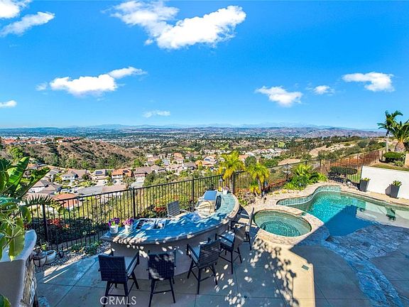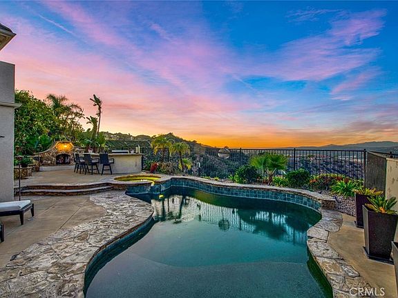 Spectacular, breathtaking views from this sought-after single-family home in the Serrano Heights community of Orange! Located on the rarely available single-loaded Chadwick Parkway, this spacious residence features four sizable bedrooms and four bathrooms. The main level includes a formal living room, currently set up for entertaining with a pool table and cozy sitting area. A large, open kitchen with an oversized center island flows seamlessly into the dining and family rooms, where a fireplace and direct access to the backyard create an inviting atmosphere. A downstairs bedroom, used as an office, includes an en suite bathroom and French door access to the backyard. Upstairs, the spacious family room/den provides additional space for relaxation and can easily be made into 5th bedroom.. The primary suite boasts a private balcony with stunning views, a large walk-in closet, and a luxurious bathroom with an oval tub and walk-in shower. Two additional upstairs bedrooms share a convenient Jack and Jill bathroom. Additional amenities include a two-car attached garage with extra room for storage that could serve as a third-car garage, plantation shutters, designer tile floors throughout, custom paint and lighting, solar energy, a tankless water heater, dual air conditioning, and custom cabinets in closets. The backyard is an entertainer’s dream, featuring a professionally landscaped pool and spa, a built-in barbecue, and stunning city lights views. This exceptional property offers the perfect blend of comfort, luxury, and captivating scenery!