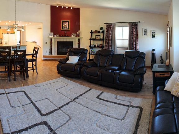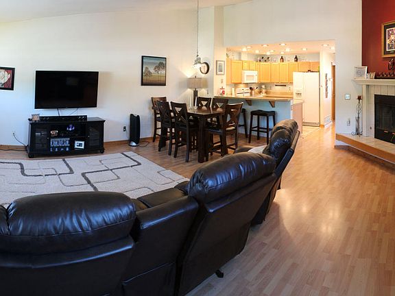 This beautiful home features a tiled entryway, open floor-plan w/vaulted ceilings. Kitchen w/granite tiled countertops, recessed lighting, oversized sink, tile flooring. Living are has vaulted ceilings, fireplace, door to front deck area. Two bedrooms down - one carpeted, one w/hard wood, master bedroom up. Landscaped yard w/flower bed, shed, and fire pit!