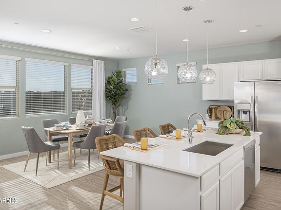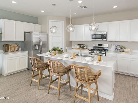 A collection of brand-new single-family homes located in the master-planned community in Mesa, AZ. The community feeds into the highly rated Gilbert Public School District, making this an ideal place for growing households. There are many onsite amenities at the masterplan everyone will enjoy, including a swimming pool, basketball court, pickleball court, playground and picnic area. Commuters have easy access to Loop 202 and Phoenix-Mesa Gateway Airport for travel accommodations. This beautiful home features our platinum package including Sonoma Maple Linen cabinets and quartz countertops. Super Luxury 7 x 22 tile flooring.