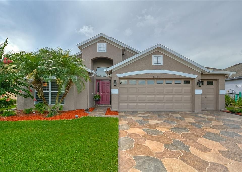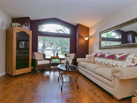The Groves..Adult 55 Plus Golf community..Incredible Waterfront/Golf Course/ Conservation lot! This home features 3 br's plus a study, 2 baths, 2 car garage plus a golf cart garage, approx. 2200 sq feet. Beautiful covered lanai with screened pool with waterfalls overlooking the water, conservation and golf course. Pool is solar heated and recently resurfaced with an aggregate finish & the oversized deck was recently stained. As you enter you with notice the beautiful hand scraped wood floors throughout the main living areas. The eat in kitchen opens to the family room and features wood cabinets w/ 42" Uppers, granite counters, all stainless appliances(refrigerator only 2 months old), island, built in buffet with glass front cabinets and crown molding. The family room features crown molding and a sliding door to pool area. The master suite has a large walk in closet, an adjacent study or exercise room with charming window seat, the bath has a garden tub, separate shower, 2 vanities with sinks with brushed nickel faucets. The tile & listello on the tub & shower is upgraded. Home has a split floor plan with 2 br's on the other side of home, perfect for company. Water heater, water softener, pool pump & disposal have been replaced. Pool cage has been rescreened with Super Screen. There is a front invisible screen door. The washer/dryer, garage cabinets & shelves stay! The Groves offers tennis, boccie & pickle ball, club house, restaurant, shuffleboard, dog parks & more!! No Mowing of yards!!