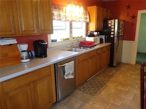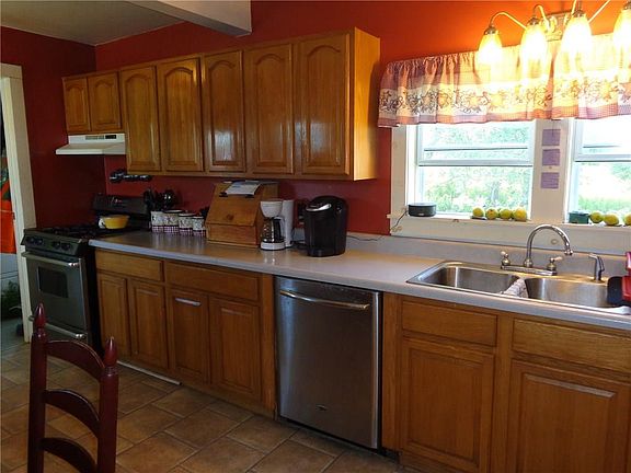 Two or three bedroom home situated on about 5.9 acres in the hamlet of New Bremen. Features a modern eat-in kitchen, living room or dining room with wood burning stove, a front living room or bedroom (has been used as both), a half bath and laundry room on the first floor. Has 2 bedrooms and a full bath on the second floor. There is an oil fired boiler for the hot water heating system. Owners use the wood stove as the primary source of heat. The exterior siding is vinyl, the roof has architectural shingles, both in satisfactory condition. There are 2 covered porches and a 2 stall detached garage. The range, dishwasher and dryer remain. The refrigerator and playhouse/shed negotiable.