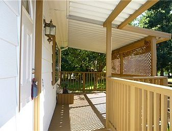 55 & over age restriction. Well maintained 3 bedroom 2 bath home backs to greenbelt area. Laminate floors. Updated baths. New attic & under home insulation. Covered deck. Heat pump w/AC. Large master w/full length closet. Dining area plus kitchen w/eating space. Newer large skylight in kitchen area. All appliances included; washer/dryer are negotiable. Shed w/electricity. Active Clubhouse. Space rent of $733 includes water/sewer/garbage.