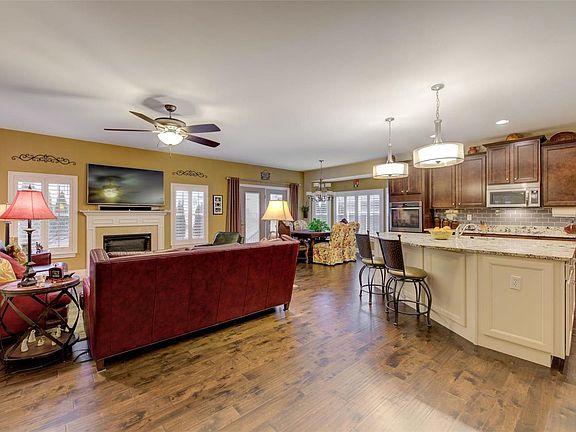 Outstanding villa in secluded yet convenient neighborhood! Open floor plan design included two main floor bedrooms and baths PLUS a den with glass French doors! Lovely scraped hardwood flooring throughout the home trimmed with upgraded tall baseboards. Plantation shutters on every window! Huge great room with fireplace is open to dining area with 5 window bay and gorgeous kitchen. Quartz countertops grace the big center island and wall counters as well. Stainless steel appliances and corner pantry, Island overhangs for stools. Master suite features a large walkin closet and bath boasting his and hers vanities and big walk in shower as well as a linen closet. The guest room features a charming window seat! Nice sized entry from two car garage and separated laundry room. Full unfinished basement has a lookout window and rough in bath for future expansion. Patio off the dining room with neighborhood walking trails nearby. Gently lived in and only 5 years young, this is better than new