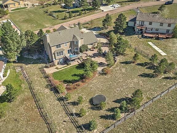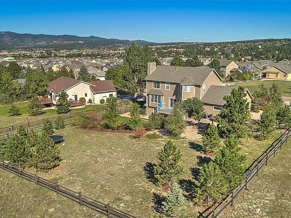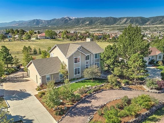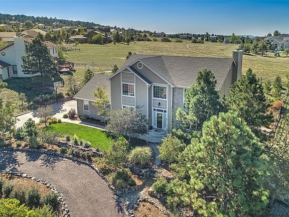 Amazing Pikes Peak views from 2-story nestled on over 0.60 acres that backs to open space! The walk-out leads to incredible outdoor living featuring multi-level brick paver patio, built-in firepit, custom landscaping and raised garden beds. Cozy up to the gas fireplace in living room that opens up to large eat-in kitchen. Bright kitchen has slab granite, large pantry, stainless steel appliances, island w/breakfast bar and those front range views! Host your next holiday gathering in separate dining area. Retreat upstairs to your spacious master suite with adjoining 5-pc bath w/ dual vanities and soaking tub. Basement ideal for entertaining, over-night guests or multi-generational use. Walk-out features gas fireplace in family room, wet bar, BR/office with French doors & built-in shelves and additional space off family room. Convenient main level office with French doors.