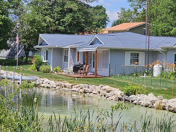 This lakeside property is a unique blend of luxury, comfort, and convenience, with 289 feet of lake frontage offering stunning water views. Located on a tranquil peninsula with only two neighbors, the property promises privacy and a peaceful environment. Boating enthusiasts will appreciate the nearby marina, adding ease for boat storage and access. Mother-in-Law Suite The property features a separate-entry mother-in-law suite complete with its own living room, full bath, and kitchenette. A pocket door ensures privacy between the suite and the main house, offering flexibility for multi-generational living or guest accommodation. Ample Garage Space with an attached 2-bay oversized garage with a breezeway into the house and a detached single garage provide abundant storage and parking space for vehicles and equipment. Interior Design with the home's spacious layout includes a living room and a family room with a fireplace, creating a cozy ambiance. The kitchen is equipped with newer custom solid oak cabinets and a snack bar, enhancing both storage and functionality. Energy Efficiency replacement Low-E windows throughout the home improve energy efficiency, while a whole-house generator ensures uninterrupted power. Convenient Amenities with a 9x10 walk-through storage/pantry, a breezeway/mudroom off the waterside, and a fenced-in area with a doggy door make the home practical for everyday living. Additionally, a room off the breezeway/mudroom is currently used as a fourth bedroom. Lakeside Features of the property includes a boat docking area with a seawall and permanent dock, offering easy year-round access without the need for seasonal removal. No History of Water Issues in over its 54-year history, the property has never experienced water-related issues, providing added peace of mind. This property combines scenic beauty, modern amenities, and thoughtful design, making it a perfect choice for those seeking a luxurious, relaxed lakeside lifestyle. Buyers are encouraged to verify all property details, including taxes, with the local assessor, as these may change post-purchase.