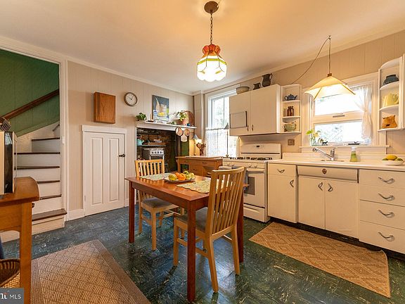 Charming colonial filled w/character in the heart of quaint Riegelsville! This home features views of the Delaware canal & towpath (flood insurance NOT required). The sunny enclosed porch welcomes you (great for cozying up w/a cup of coffee, a good book or a glass of wine). 1st floor features spacious living & dining rooms, both w/pine floors, kitchen w/walk-in fireplace, propane range, portable dishwasher, pantry & rear pie stairs. Also on this level is the laundry room & powder room. 2nd floor features two bedrooms, a guest nook/den/office (all w/wood floors), and a large modern bath w/custom sycamore vanity. The 3rd floor w/vaulted batten ceiling is currently being used as an artist studio, but lends itself to many possibilities. Enjoy sitting around a fire on a cool Summer/Fall evening in the private back yard featuring varietal bushes & perennials. Full basement has outside entrance. 700 SF detached workshop/garage houses your toys or makes a great Mancave/Sheshed. Low taxes too!