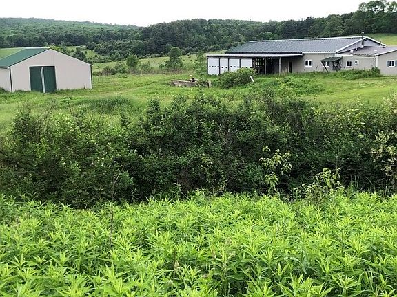 This 33 acre property is the perfect setting for a rural home business and the owner is willing and able to finance! Updated 2,968 square foot 3bedroom/2bath home with vaulted ceilings, large kitchen with beams and vaulted ceiling, large laundry room, spacious living room/dining room with a fireplace, porch/deck, attached unfinished 1bd/1ba apartment. Master bedroom has walk-in closet. Office building w plumbing, 7,000 watt solar electric system, several large pole barns. The circular driveway is built to withstand heavy loads and parking. Maybe you will want to open an auction barn, storage center, farm supply store, or convert the buildings to house horses, sheep or goats, store grains, hemp, or hops. About 20 acres of field and pasture, 10 acres of woods with a pond. Great opportunity.