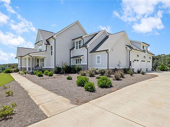 Welcome to this stunning home perfectly situated on 5 private acres within a gated community, offering breathtaking lake views and ultimate privacy. The large covered front porch with stately columns sets the tone for the charm and elegance found throughout. The private owner’s suite is conveniently located on the main level, featuring a spa-like bathroom with double vanities, walk-in shower, soaking tub, and private water closet. The gourmet kitchen is designed for entertaining, complete with a spacious island topped with quartz countertops, stainless steel appliances including a gas cooktop, wall oven, microwave, dishwasher, and built-in beverage storage. A walk-in pantry provides ample space to keep everything organized. Enjoy seamless open-concept living with views from the kitchen into the family room, where a beautiful fireplace, custom bookshelves, and access to the covered back patio create the perfect gathering space. Upstairs, you’ll find three additional bedrooms plus a finished bonus/bedroom with a full bath—ideal for guests or flex space. This home showcases a high-end trim package and gleaming hardwood floors in the foyer, office, family room, kitchen, and dining area. There is also an option to purchase an additional 5+ acres directly adjacent to the property for those seeking even more space.