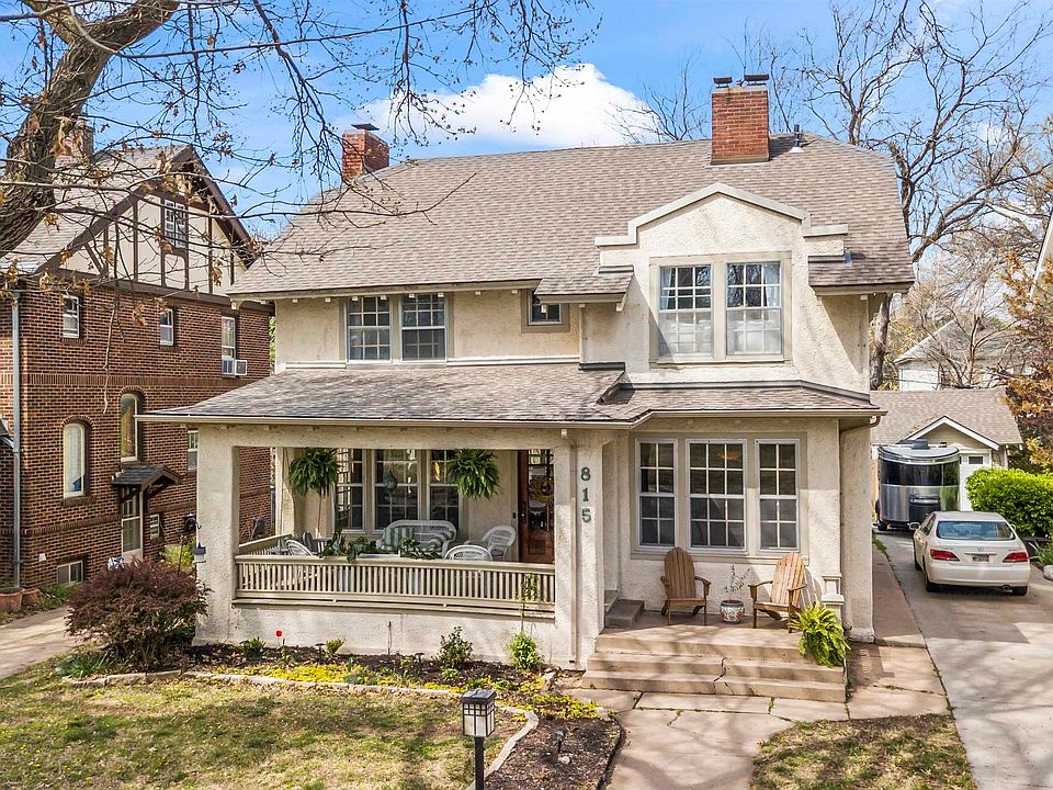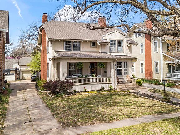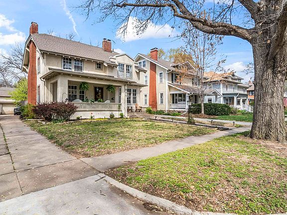 Beautiful 2 story home on a tree lined brick street across from Riverside park. This spacious home has 4 bedrooms, 2 baths, a stunning living room with a fireplace, a formal dining room, wood floors, wood built ins and large windows throughout. The roomy (14x14) kitchen has cabinets on all 4 sides, lots of counter space and room for a breakfast table. The laundry is located on the second floor with the roomy bedrooms. Relax on the covered front porch or stroll across the street to Wichita’s first park. The house is located close to playgrounds, parks, tennis and pickleball courts, Wichita Art Museum, The Indian Center, Exploration Place, Botanica, Sim Golf Course, bike and walking paths, Downtown, Old Town and Delano. Don’t miss out, this home and location is wonderful. Flames in fireplace are simulated.