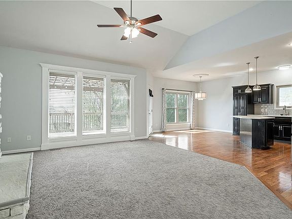 This gorgeous 1.5 Story home offers spacious living areas flooded with natural light. The main level features vaulted ceilings, a cozy fireplace, and a seamless flow into the kitchen and dining areas. Sleek black cabinets complement white quartz countertops in the kitchen, which includes an inviting island and ample storage.