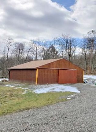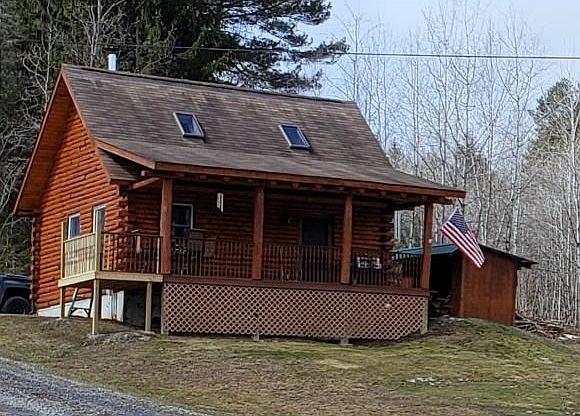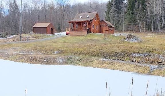 Unique, well built, private LOK-N-LOG home in a beautiful setting overlooking a pond. Open flr plan in cozy living area w/wood stove. Newer addition of lge Master BR w/large closets. Redone BA. Energy efficient windows. Wonderful loft, currently being used as a LR, previously used as a BR. 24 x 18 deck for relaxing and enjoying the beautiful view. New 22x24 detached garage - low taxes. A MUST SEE!