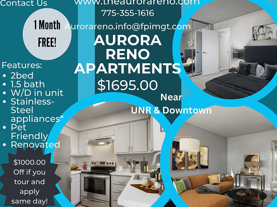 This two-bedroom, 1.5-bathroom townhome apartment is available for immediate move-in and includes modern appliances, washer & dryer, and private patios. This pet-friendly community offers mature landscaping, a laundry facility, and an assigned parking space. Located near the University of Nevada, Reno this area of Reno allows locals to reside near downtown Reno and its many attractions. With nearby San Rafael Park and quick access to both major highways, Residents will find themselves close to everything they need. Take a class at the college, attend a festival or concert in downtown Reno, or visit a local eatery. Whatever your interest, you can find entertainment in the outer university neighborhoods. Please contact us and schedule a tour to learn more about Aurora Reno1 Apartment Amenities: Washer/Dryer in unit Kitchen appliances include refrigerator, range w/ oven, dishwasher Disposal Carpet & Vinyl Flooring Window Coverings Central heating Our Residents Enjoy: Easy access to University of Nevada, Reno Easy access to I-80 & McCarran Blvd. Off-street, assigned parking Onsite laundry facilities Pet friendly (breed restrictions apply) Mature landscaping Lease Terms & Fees: Application Fee: $45 per applicant Holding Fee: $100 due at time of applying, and applied to Security Deposit Deposit: $400 Non-Refundable Admin Fee: $150 Terms: 6-, 9-, and 12-Month Pets: Dogs and cats under 40lbs are welcome. Max two (2) pets permitted per apartment. Must be registered, with current health and shot records provided and a signed Animal Addendum signed upon move-in. EQUAL HOUSING OPPORTUNITY Terms: 6-, 9-, and 12-Month