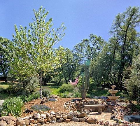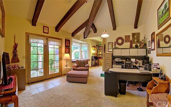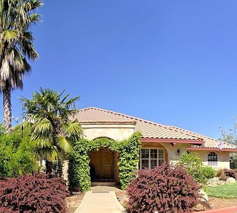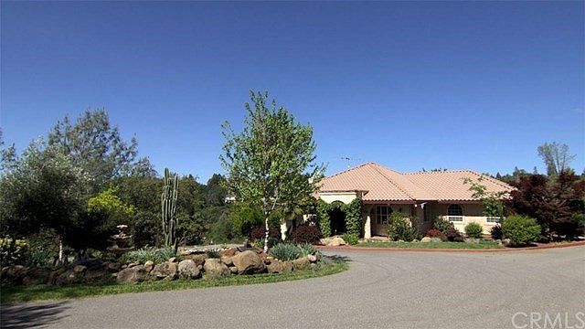 Stately 3041sqft 3br 3b home on 3.44ac. Walled courtyard, tiled upper patio, lower patio. Vaulted beamed ceilings formal tiled entry. LR with gas fireplace & family room with woodstove. Formal dining room plus library/den with built-in bookcases and French doors. Master suite with sitting area and large bath with Jacuzzi tub, separate shower, two sinks, walk-in closet plus mirrored closet and entrances to patio and deck. Sunny fenced garden, meadow & area for pool, horses or shop. Private, paved driveway with circle drive, full RV parking with hookups. Family room, 2 bedrooms & bath down stairs, perfect for teens, guests, or grandma, with separate entrance & 1-car garage on lower level.