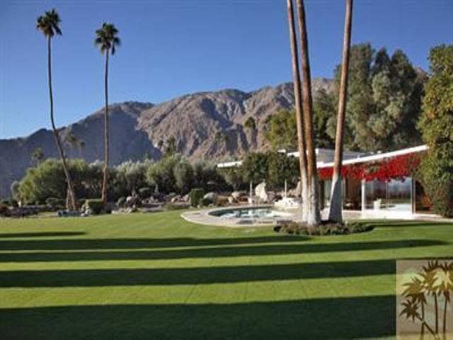 Nearly 3 acres, this magnificent gated mid-century compound combines sprawling grounds and elevated views over the entire valley. First thing that comes to mind when walking the grounds here is that one has been transported into the middle of a Slim Aarons photograph. Lush green spaces, old growth trees, granite boulder outcroppings, rose gardens, and water features entertain the senses as one strolls the grounds of this historic property once owned by world renowned composer Frederick Loewe. Built in 1956 the home features 4 bedrooms, 4 baths, acres of glass and your own tennis courts with lights. This is truly one of the most unique and exclusive offerings in the entire Palm Springs area.