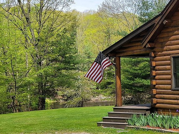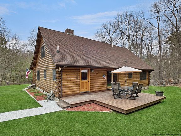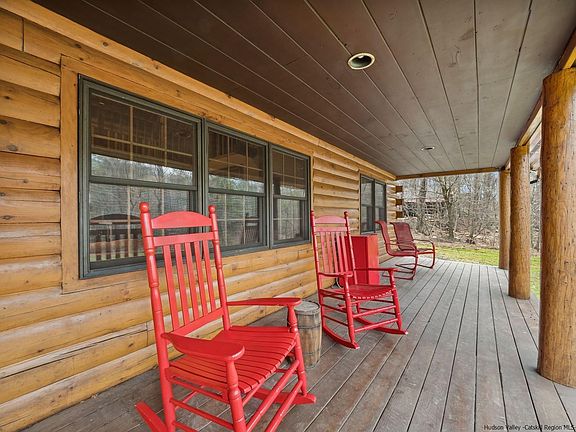 Nestled at the end of a long private driveway, sits this country getaway in complete seclusion. Step into the expansive living room adorned with vaulted ceilings and an inviting exposed loft, complemented by a rustic woodstove nestled within a stone chimney, exuding the cozy charm unique to log cabin living. French doors seamlessly blend indoor and outdoor spaces, leading to a spacious back deck ideal for entertaining amidst the tranquility of nature. Adjacent to the living area, a well-appointed kitchen and dining space beckon, featuring a Heartland Classic six-burner stove that enhances the cabin ambiance. Two generously sized bedrooms and a full bath complete the main level, offering comfort and convenience. Ascend to the upper level to discover the primary bedroom retreat, accompanied by a full bath boasting a rejuvenating jacuzzi tub. Additionally, the loft area presents endless possibilities, whether utilized as a tranquil den or a productive home office space. Over 400 feet of frontage on the Glad Kilpt Kill, a calm, meandering waterway, which provides year-round outdoor activities including fishing, canoeing, ice skating and ice fishing. Or relax and unwind in your rocking chair on the covered front porch overlooking the picturesque pond and enjoy the abundant local wildlife. This private oasis is conveniently located just a short 10-minute drive from the vibrant center of the quaint town of Stone Ridge and the scenic Ashokan Reservoir, with easy access to nearby attractions such as the renowned hiking trails of Mohonk Preserve and Minnewaska State Park, ensuring every day is filled with adventure and natural beauty. Embrace the essence of country living in this serene retreat, where every moment is a peaceful escape from the ordinary.
