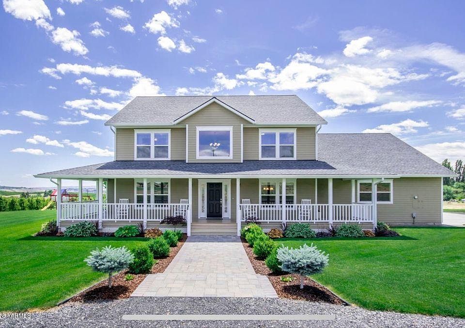Beautiful custom 2 Story, 4 Bedroom home with custom woodwork throughout. Situated on 5 private acres (2 1/2 fenced) with great views of the valley and surrounding orchards. This home is located in in the country, but still a quick 10 minutes to Fred Meyer. Home features a front covered wrap around porch along with a covered back patio. It has pavers on the both the front sidewalk and patio. The kitchen has custom cabinets throughout with tons of extra storage.