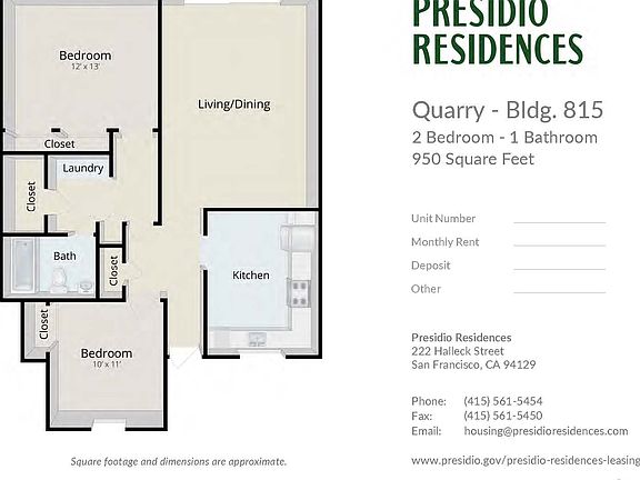 The Presidio Residences is pleased to announce availability in our Quarry neighborhood. The Quarry neighborhood is located in the sunny eastern Presidio on a quiet cul-de-sac. Offered at $4,350* per month, 815-C Quarry Road is a 2-bedroom, 1-bathroom apartment with approximately 950 sq. ft. This apartment features a large living and dining area, kitchen, sunny deck, large storage closet, and a designated parking space. We will have an open house on Wednesday, July 9, 2025 from 10:30 a.m. to 11:30 a.m. We will begin accepting holding deposits immediately after the open house, following our priority system. Additional Information: Holding deposit is $4,350.00 Application fee is $46.00 per adult Parking permit for each additional vehicle is $100 per month, 2 cars maximum Two household pets are permitted with an additional $500 deposit per pet, and a pet rent of $75 monthly per pet. Current vaccination records, spaying/neutering records, emergency caregiver contact information, and veterinarian contact information are required All applicants must meet the Presidio Trust's standard residential screening criteria. This includes, in part, credit check, criminal background check, verification of income and assets, and verification of past residences. *Prices reflect a twelve-month lease with a move-in date by or before 7/19/25. Other options and longer lease terms are available, please speak with your leasing agent for details. Pricing may change after 7/9/25 Get to Know the Presidio Events Food Golf PresidiGo Shuttle Trails Biking Places To Visit Community Amenities One Designated Parking Space Multi-year leases available Recycling Apartment Amenities Carpeted Floors Storage Washer and Dryer Hook-Ups Monday - Friday 9:00 AM - 6:00 PM Saturday 10:00 AM - 4:00 PM Our office is closed on Sunday Federal law prohibits housing discrimination on the basis of race, color, national origin, religion, sex, familial status, or disability.