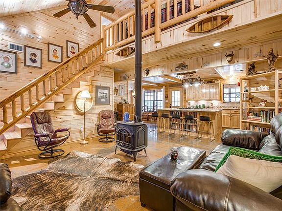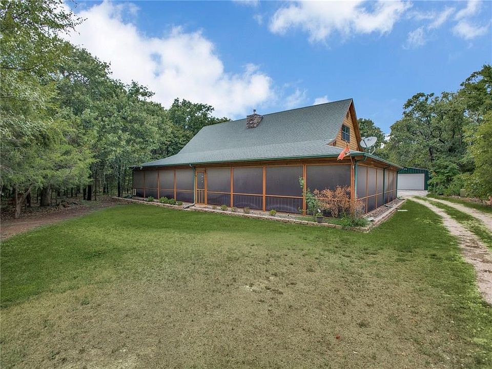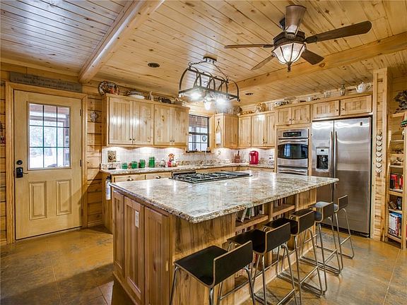 Remarkable LOG HOME with 1,568 sq.ft. WRAP-AROUND SCREENED PORCH-- within 2 acres of mature oak trees at the end of a CULDESAC LOT. Backs to Corps of Engineer Property, Lake Ray Roberts! Floorplan includes 5 bedrooms, 4 full baths, 2 living rooms, & 2 dining areas.Vaulted ceilings in Great Room open to kitchen & dining. Kitchen includes island bar, granite countertops, double convection ovens, stainless appliances. 1st floor Master with updated bathroom, sitting area, & walk-in closet. Three bedrooms & 2 full baths on first floor! Two bedrooms with walk-in closets & 2 full baths upstairs plus MEDIA-GAMEROOM with refreshment center & lots of built-ins.Covered patio with hottub & private half-bath. DEER & BIRDS!