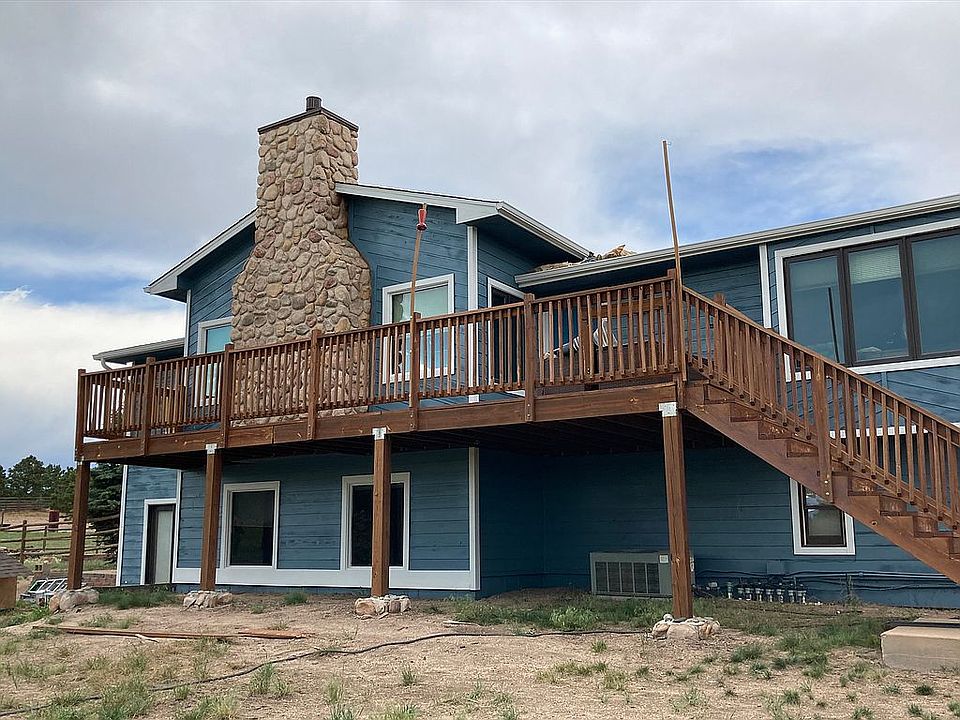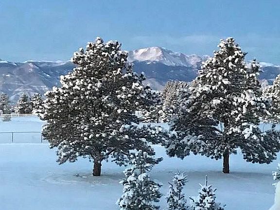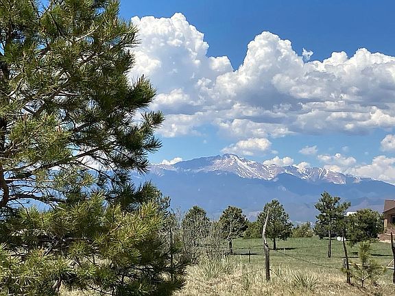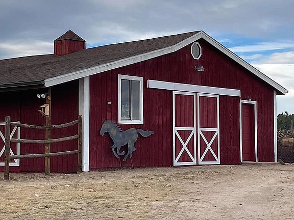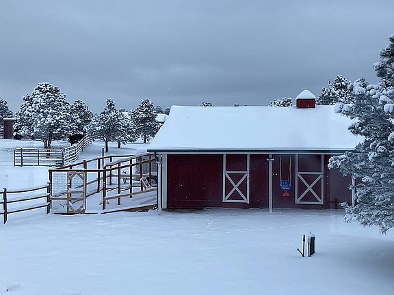 Sought after close-in rancher in south Black Forest with fantastic mountain and city light views, a 42x30 barn/workshop and loafing shed. Desirable District 20 Schools. Gorgeous 5 acres with trees, meadow, fenced dog run, fenced horse pasture, RV parking pad, domestic well and gorgeous Pikes Peak Views. Only 4 miles from the Woodmen Road and Black Forest Road intersection allowing you the best of both worlds - close to the amenities of the city with acreage. Zoned for horses! No covenants or HOA. Walk-out basement with private entrance, kitchenette, 2 bedrooms, an office and large family room - perfect for multi-generational living or a teen suite. The basement features new carpet and wood flooring. The main level is bright with many windows, large room sizes, formal living room and family room. The formal living room features vaulted ceilings and a gas fireplace with river rock surround. Large family room with tons of windows and a walk-out to one of the decks. Multiple outdoor entertaining areas including two large freshly stained decks to take in the views of the treeline and mountains. Spacious kitchen with an abundance of cabinetry, island and eat-in kitchen nook with bay window. Main level master suite with walk-in closet, 5-piece master bath w/ jetted tub and fantastic mountain views. The 40x30 barn/workshop has concrete floors, a water faucet, stall doors and an insulated workshop with plenty of electric and a wood stove.