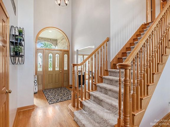 Peaceful Paradise. Exquisite, custom-built brick home. Beautiful quiet country setting in the perfect location - between Clinton and Saline, in the highly desirable Saline School System! Beautiful entryway with soaring ceiling and arched transom with a formal dining room and large home office. Step down into the great room with a 2-story ceiling and fireplace flanked by windows. Relax in a large wonderful 20x32 family room. Peninsula kitchen provides snack bar and breakfast nook. Main floor primary suite has a cathedral ceiling, built-in bookcase and bayed windows. Primary bath presents vanity with dual sinks, whirlpool tub and walk-in closet! Second floor features three nice-sized bedrooms with full bath and gorgeous views. Entertain in the partially finished lower level walkout. The finished garage has plumbing. There's a HUGE 30x52 pole barn with drained floors, 220V electric, NEWLY insulated with close cell insulation. MAJOR upgrades to this home include: Stone and Brick walkways going to both the front and rear of the home as well as 100 yards of NEW concrete driveway. Beautiful 8+ acres with picturesque views of the open land. Seller providing HOME WARRANTY for peace of mind.