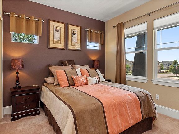 Beautiful home in Banning Lewis Ranch w/ mountain views. As you enter the home you are greeted to stunning custom Travertine tile/mosaic floor inlay on Hickory hardwood flooring that flows through the main level. The kitchen boasts 42" cabinets, a Travertine backsplash, granite countertops, large island and walk-in pantry. The spacious living room has built-in shelving around the gas fireplace, which includes a hub connecting nearly the entire home with built-in surround sound! The master bedroom has an adjoining 5 piece bathroom with a walk in closet! The main floor also features a formal dining room, a 2nd bedroom adjacent a full bath, a sizable office w/ built-in cabinets & convenient main floor laundry sink & cabinets with access to the oversized 2-car garage! The finished basement offers a large wet-bar to include a dishwasher, sink and wine fridge, an entertainment area with built-in cabinets, 2 bedrooms, a full bath & storage room! Banning Lewis club amenities included!