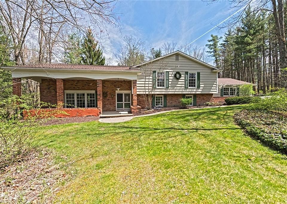 Move right in to this delightful split-level located on a serenely wooded 1.9 acre lot in Chagrin Falls! As you step inside, you will appreciate the spacious living room and wood-look floors that flow into the formal dining area. You will love the little greenhouse off of the dining room, perfect for displaying your plants and flowers. The stunning kitchen boasts custom cabinets, granite countertops, double ovens and a sunny eat-in area. The kitchen steps down to the family room, which features a sunken bar, a fireplace and sliding doors to the private backyard patio. A half bath, a mud room, and a laundry room complete the first floor. Upstairs, you will find a spacious bonus room perfect for a rec room, media room, or office. The lovely master bedroom features a walk-in closet and an en-suite bath that connects to the adjacent bedroom. Three additional bedrooms and another remodeled full bath complete the interior of this home. The wooded backyard provides peace and privacy, and you are sure to enjoy the patio and covered front porch on warm summer days. Recent improvements include a newer furnace, a newer roof, and a newer water heater. Located on a wooded, 1.9 acre lot on Chagrin Road, this home provides privacy without sacrificing convenience; it is just minutes from shopping and dining in downtown Chagrin Falls. You will not want to miss the opportunity to own this lovely home!