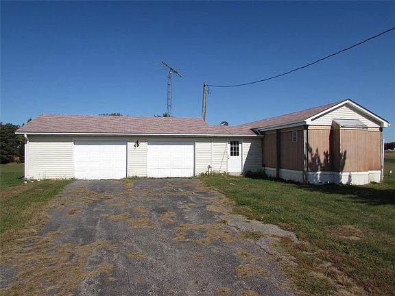 Single wide mobile home with large 2 car attached garage on 1.848 acres in the country! Features 2 bedrooms, 2 baths, high efficiency furnace & A/C, eat-in kitchen, front porch, custom framed roof, & more! Mobile home converted to real estate through auditor's office. No foundation for mobile home.