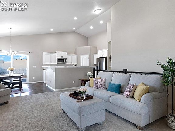 Beautiful ranch home located on a large lot in the Cumbre Vista neighborhood. The main level boasts of a wide-open floor plan with a large kitchen with stainless steel appliances, quartz countertops and a large pantry. The dining area, with a walkout to a covered deck, flows directly to the great room with a gas fireplace, large windows and vaulted ceilings. The main level master features an attached 5pc master bathroom, walk-in closet, and vaulted ceilings along with access to the covered composite deck. The second and third rooms are serviced by another full bathroom and there is main level laundry. In the basement you will find a spacious family room with 9ft ceilings and a walk-out to the covered concrete patio and fenced in backyard. You will also find 3 more large bedrooms that are serviced by another full bathroom and multiple storage rooms. This home is situated near Woodmen and Powers and is near District 20 schools, shopping, and fitness centers. This home has it all!