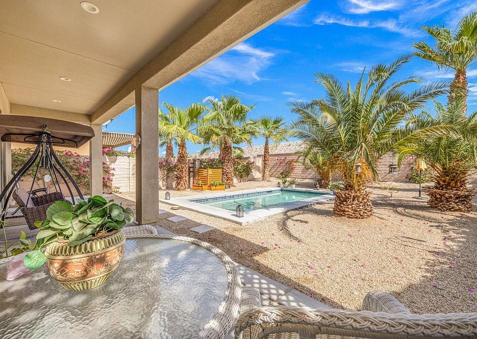 EMBARK- 'to begin a new journey' There is no question as to why the Builder aptly named this floorplan! Let your new journey begin with a private pool home under $500k in the popular 55 plus community of Sun City Shadow Hills. Home is situated on an extremely private lot at the back of the community with no neighbors behind you. Relax in your outdoor oasis with sparkling pool, just large enough to dip in and cool off- reminiscent of mediterranean gazing and meditation pools. Looking for more action? Community boasts larger community pools (one indoor), 2 Golf courses, fitness centers, tennis, pickleball, Bocce courts, dog parks, 2 Bistros and a restaurant. Combined with many social activities and social clubs - this home allows you the best of both worlds. Home is being offered turnkey furnished. Enter Greatroom with dedicated office space and built ins, dining, living and large kitchen with granite slab counters, Kitchen island, pantry, all appliances including 5 burner gas range. Primary suite with walk in closet. Second bedroom on opposite side of home with second bath adjacent. Indoor laundry room with storage, attached 2 car finished garage with epoxy floors. Tile throughout the entire home ( makes desert living easy!) Shutters, LED light and fan in living area. With extremely reasonable HOA dues of only $369 month that includes Guard gates, roaming security, common area maintenance and access to all of the wonderful facilities (golf is extra but reasonable) makes this a must see home! To sweeten the pot, meet the sweet foster pup - she is a cuddlebug and could be yours too!