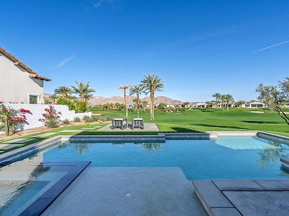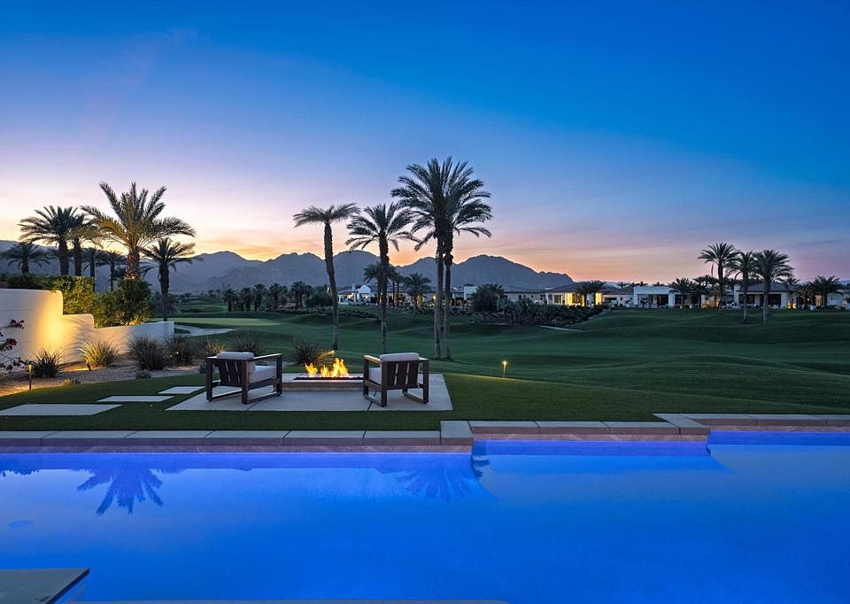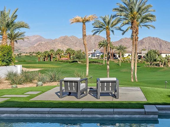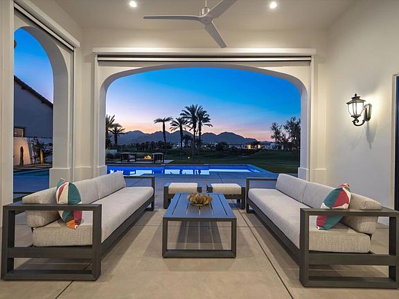 Ideally located on a quiet cul-de-sac and an oversized lot along the 11th fairway of the renowned Rees Jones-designed golf course, this stunning 4-bedroom, 5-bath home offers unrivaled views of the Santa Rosa and Coral Mountains - an idyllic backdrop for vibrant sunsets. Inside, a light-filled great room features porcelain tile flooring, a dramatic split-face stone fireplace, and built-in surround sound for immersive entertainment. Automated 12-foot glass pocket doors vanish with the push of a button, blending indoor comfort with outdoor elegance. A wet bar adds the perfect touch for effortless entertaining. The gourmet kitchen is a chef's dream, complete with Caesarstone countertops, a glass tile backsplash, and premium Wolf, Asko, and Sub-Zero appliances. Custom office cabinetry and designer lighting elevate the home's modern sophistication. The primary suite is a luxurious escape with direct access to the backyard, where a saltwater pool, spa, tanning shelf, and built-in BBQ set the stage for the ultimate outdoor retreat. A cozy firepit invites evenings spent stargazing under the desert sky. The detached casita offers a private space for guests, a home office, or personal gym. Equipped with solar panels for energy efficiency, this designer-furnished residence is the pinnacle of luxury living in Andalusia Country Club. Come live the life you've always imagined!