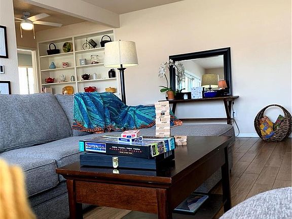 Adorable dam home! Lots of windows and natural light. Rare, separate foyer. Nest thermostat. Original Built-in's in living room, dining area, Office/bedroom. Wood burning fireplace, separate laundry room that can be converted into bathroom/laundry room with line marked to plumb for bathroom. Newer wood look tile throughout. Bath with large walk in shower and 2 shower heads. Kitchen remodeled in 2020 with new stove, microwave, dishwasher, extra large sink, quartz counter-tops, dishwasher. Great backyard set up for entertaining, with sparkling, partially sunken pool surrounded by custom deck. Dog run with doggy door. R/V or boat parking with alley access, plumbed for natural gas bbq. French doors out to large covered patio, Side yard entrance from kitchen. 2 car garage with plenty of storage and entry to house. Only a block or two from parks, schools, public pool, rec center, and historic downtown.