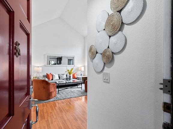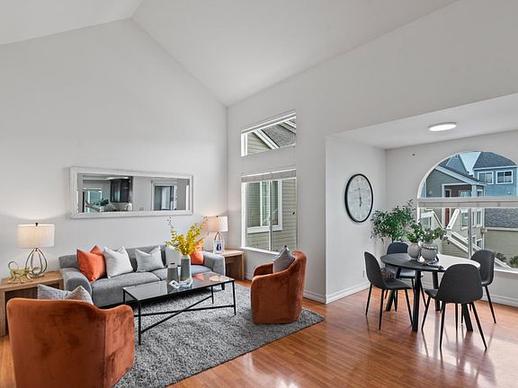 Stunning top-floor corner unit with tons of natural light and high ceilings. This home is facing a court yard, and graced by mature pine trees in the back. The inviting living room has dramatic pitched high ceilings and 2 large windows. Spacious dining area has a half-round window above a regular window. A slide door opens to a sunny balcony for relaxing and gatherings. The updated and open kitchen has 2 windows and new recessed LED lights, easy care seamless countertops, custom cabinets with two lazy-susan corner storage spaces, stainless steel appliances include a large stainless steel sink and a ice-making refrigerator with water/ice dispensers. Washer/dryer closet in hallway. The spacious primary bedroom has a wall-to-wall mirror closet and a half-round window above a regular window. The second bedroom has two windows, one of which is full-length, and a mirror closet. Short walk to the enclosed garage with a pitched ceiling for additional storage potential + a deeded assigned parking space. The community is beautifully landscaped with HOA pool/spa providing a refreshing oasis during the warm summer months. Gorgeous waterway with two walking bridges. Close to Bay Trial, RWS library, parks & Redwood LIFE business park. Shop & eat @Marketplace shopping plaza - 8 eateries & bank.