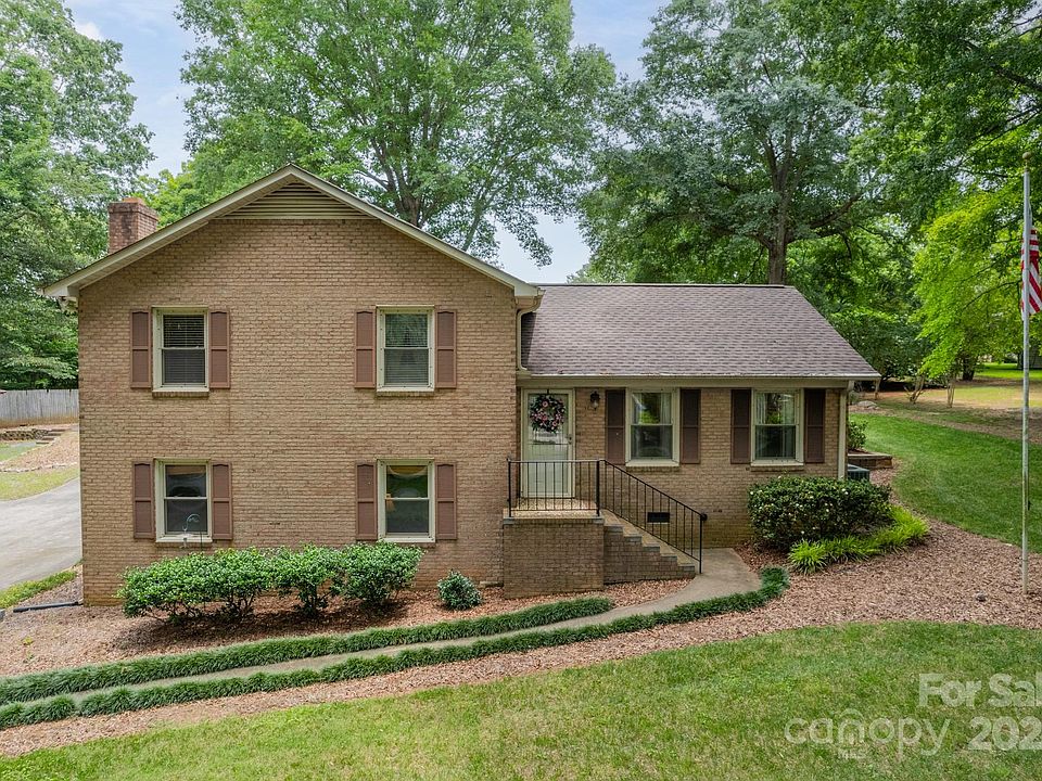 PRICE IMPROVEMENT! Outdoor living at its best from the beautifully landscaped yard, inviting brick patio, multiple sitting areas, garages & storage buildings, this property is truly one of a kind. This lovely home is nestled on .71 acres with no HOA but in close proximity to shopping, dining & entertainment. When you step inside, there are multiple areas for living & entertaining. On the lower level is an inviting den w/ stone fireplace (sold as-is, gas not connected), a bedroom/office/flex room, laundry area w/ built in cabinets, & a bathroom. Venture up a few steps to the main level to the kitchen with stainless steel appliances, formal living room, dining area, & inviting sunroom. On the upper level are 2 bedrooms, the primary bedroom, & a full bath with a soaking tub/shower & vanity w/ granite countertops. Back outside is a large detached garage with electricity, & a workshop. In addition to this are 3 other storage buildings. Garage, detached buildings, & grill are sold as-is.